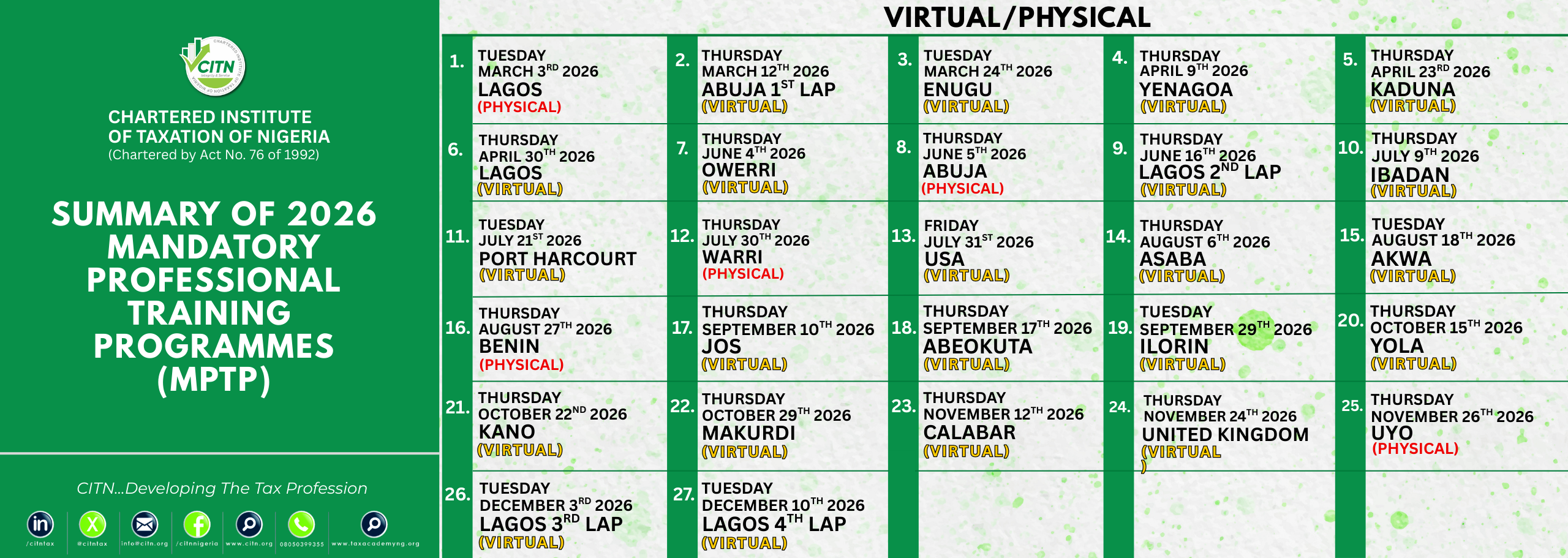 - Pursuant to the established mandates of the Institute to continuously update the knowledge and skills of its members in tax practice and administration in Nigeria, we hereby invite you to attend the 2023 Mandatory Professional Training Programme (MPTP).